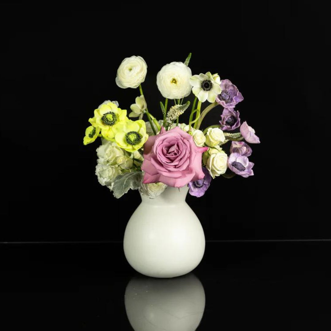 Depending on seasonality, flowers and foliage may include Anemones, Ranunculus, Spray Roses, Amsterdam Roses, Veronica Skyler, Dusty Miller.
